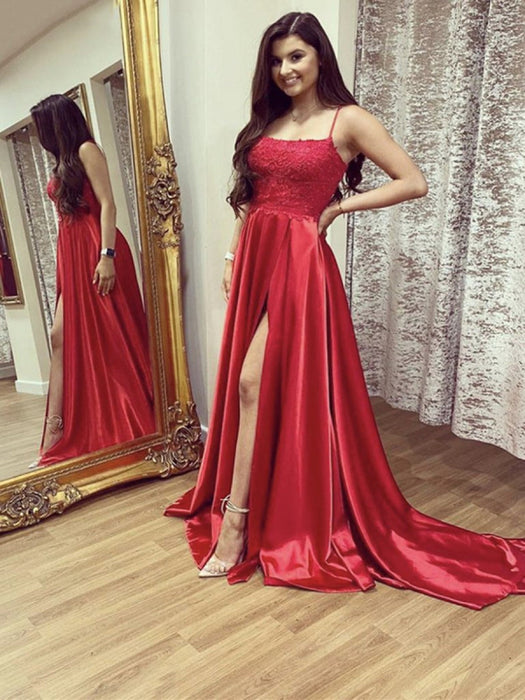 A Line Red Lace Long Prom with Leg Slit, Red Lace Formal Graduation Evening