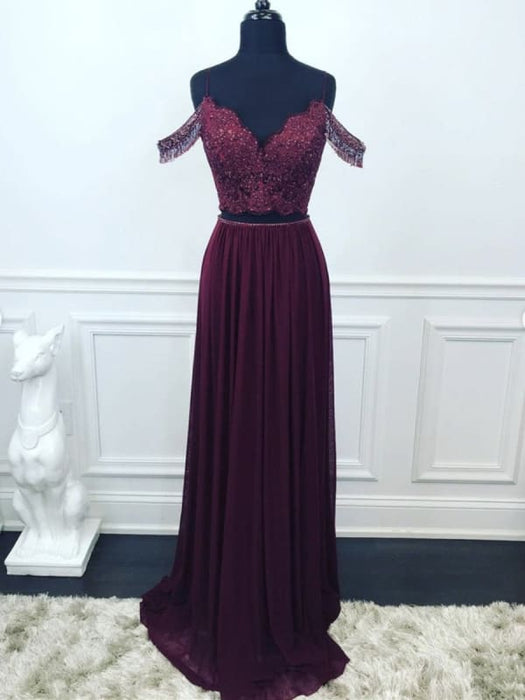 Off Shoulder Two Pieces Purple Lace Beaded Long Prom, 2 Pieces Purple Lace Formal Graduation Evening