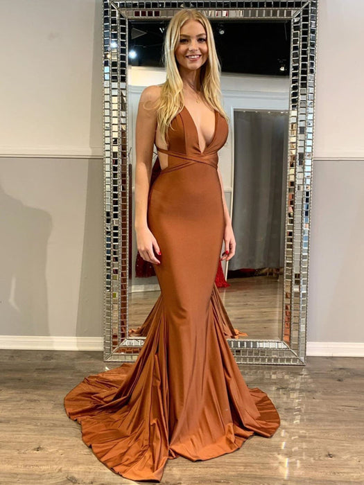 Sexy V Neck Backless Mermaid Clay Satin Long Prom, Mermaid Clay Formal, Clay Evening