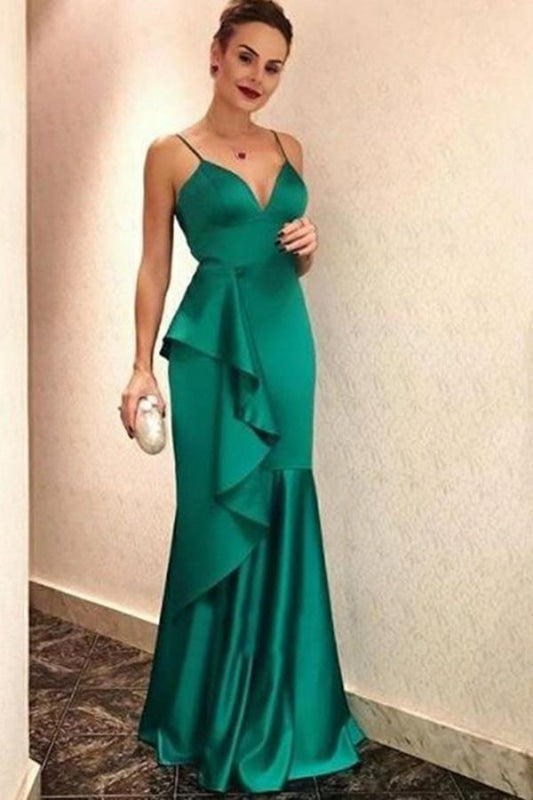 Glorious Fabulous Elegant Spaghetti Strap Hunter Prom Dress with Ruffles Elegant V Neck Evening Dresses