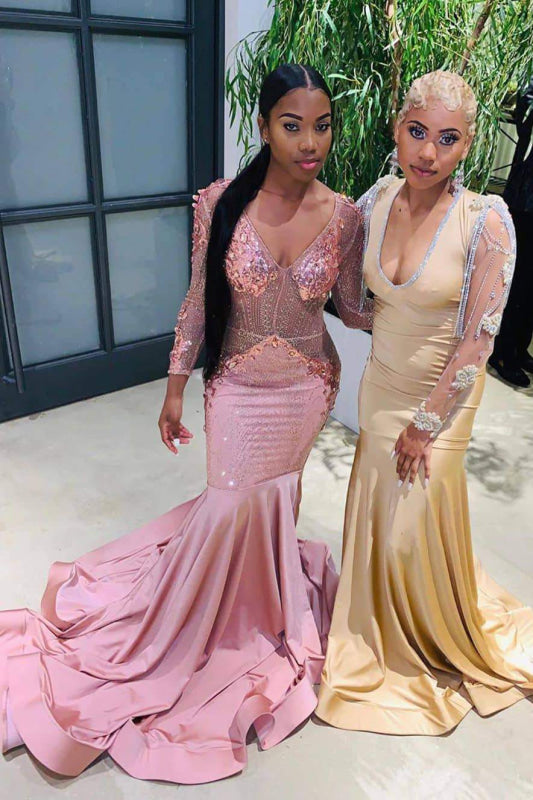Long Sleeves V Neck Floor Length Prom Dresses with Train