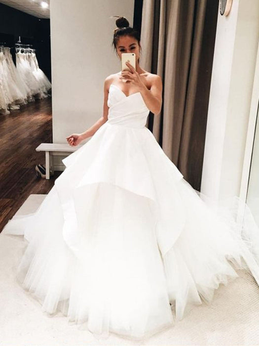 The sweetheart neckline and A-line silhouette flatter any body type, while the ruched detailing adds a touch of sophistication. Be the center of attention on your special day with this beautiful and timeless formal dress.