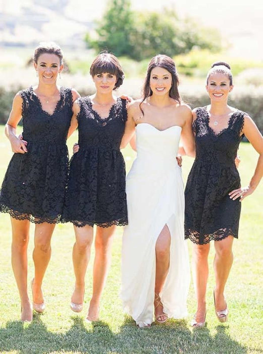 A-Line V-Neck Above Knee Black Lace Bridesmaid Dress