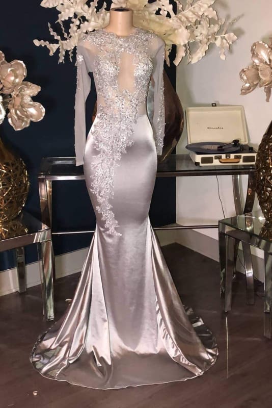 Luxury Sliver Long Sleeves Lace Appliques Mermaid Prom Dresses
