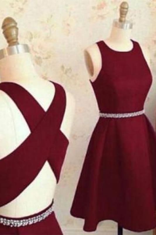 Burgundy Cute Short Prom Dresses Sleeveless Satin Homecoming Party Dress with Beads