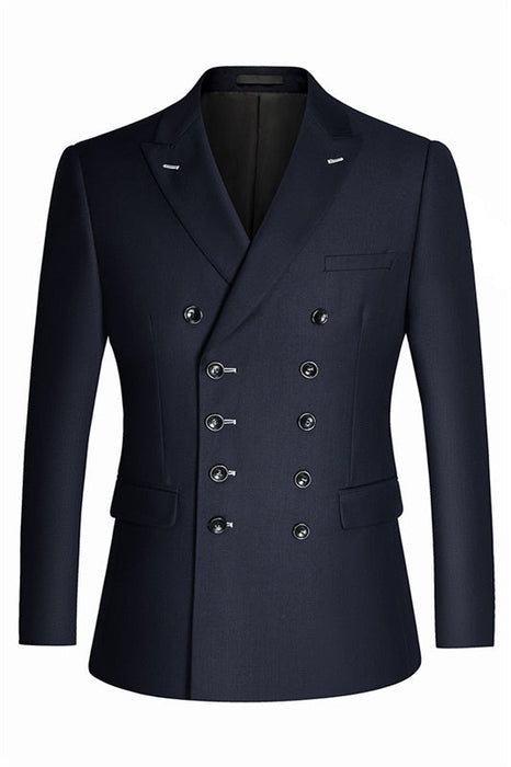 Command attention at every formal occasion with this navy blue double-breasted suit featuring sophisticated peaked lapels. Expertly crafted for the discerning gentleman, this close-fitting silhouette delivers sharp, architectural lines that enhance your frame while maintaining exceptional comfort.