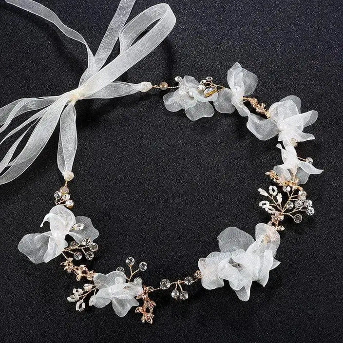 The third is a luscious headband, it has the elegant ribbon and flowers design,gold leaves style,simple and noble,really is a good choice for brides.Again with the headband, this bride is made infinitely more beautiful with the addition of a bejeweled accessory.