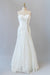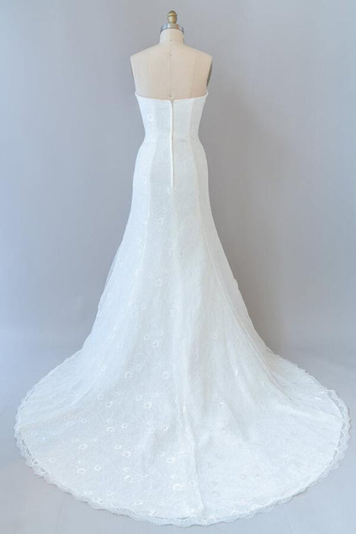This sophisticated strapless wedding dress combines contemporary elegance with timeless appeal. Intricate lace detailing adorns the bodice and cascades down the sheath silhouette, while delicate ruffles add dimension and movement to the design. The clean strapless neckline elongates the frame and showcases the shoulders beautifully, making it an ideal choice for brides with an eye for refined simplicity.ย