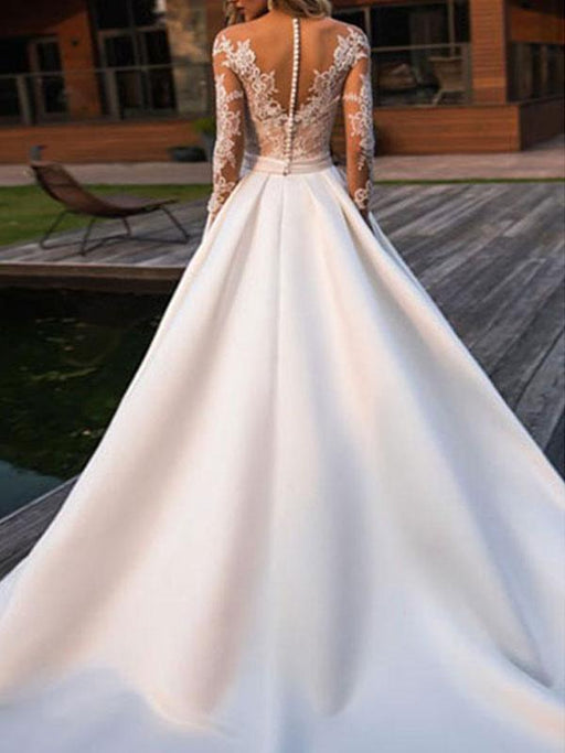 View full detailsIvory A-Line Wedding Dress with Court Train and Long Sleeves Walk down the aisle in timeless elegance with this exquisite ivory wedding gown. The r...