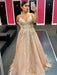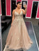 A Line V Neck Champagne Lace Long Prom, Champagne Lace Formal, Champagne Evening