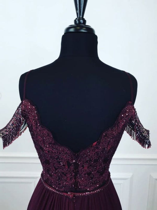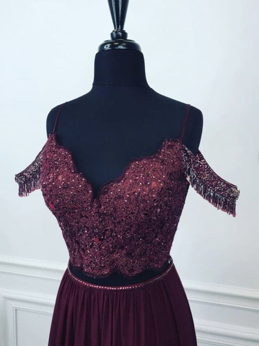 Off Shoulder Two Pieces Purple Lace Beaded Long Prom, 2 Pieces Purple Lace Formal Graduation Evening