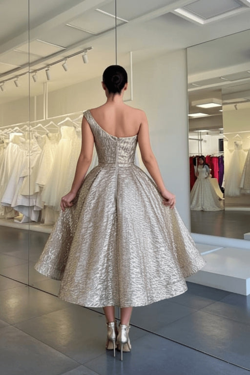 Radiate elegance in this stunning one-shoulder evening dress, where luxurious gold sequins catch the light with every movement. The tea-length silh...