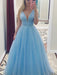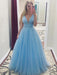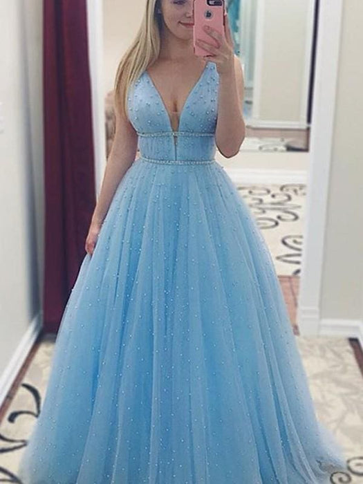 Sleeveless V-Neck A-line Pearls Tulle Evening Dresses Sky Blue