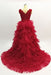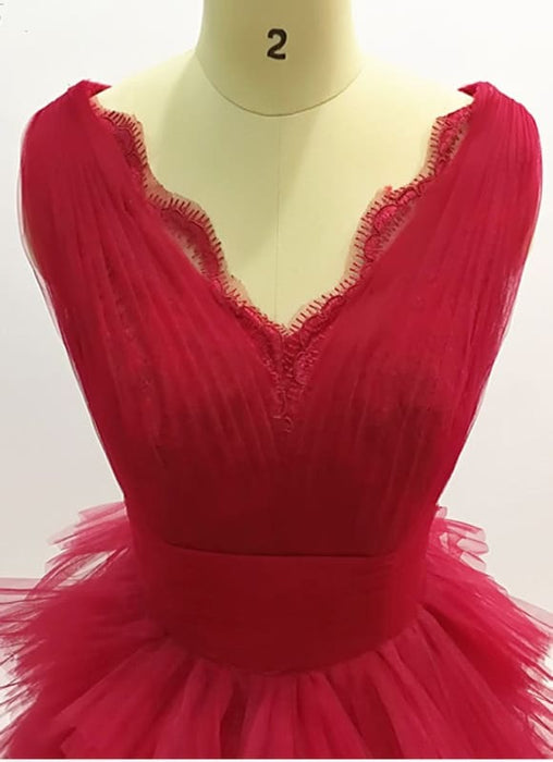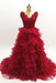 Burgundy Layered Long Evening A Line V Neck Tiered Tulle Prom Dress
