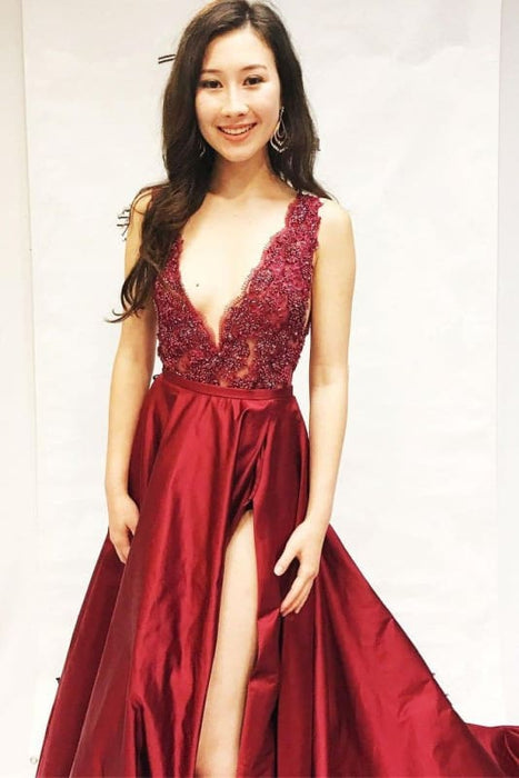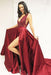 Burgundy V Neck Split Long Prom Dresses A Line Formal Dress with Slit