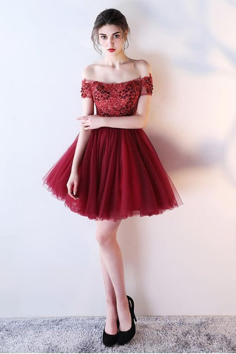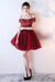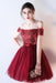Dark Red Off the Shoulder Prom with belt Short Beading Homecoming Dress