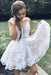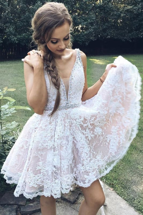 Mini Deep V-Neck Backless Lace Homecoming Party Dresses with Beading