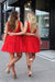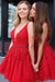Red Lace Appliqued Tulle Short Prom with Beading Waist V Neck Homecoming Dress