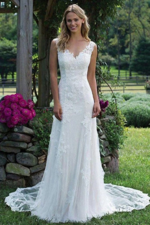 This V-neck wedding dress features an elegant open back and delicate white lace detailing, creating a timeless bridal look. The tulle A-line skirt ...