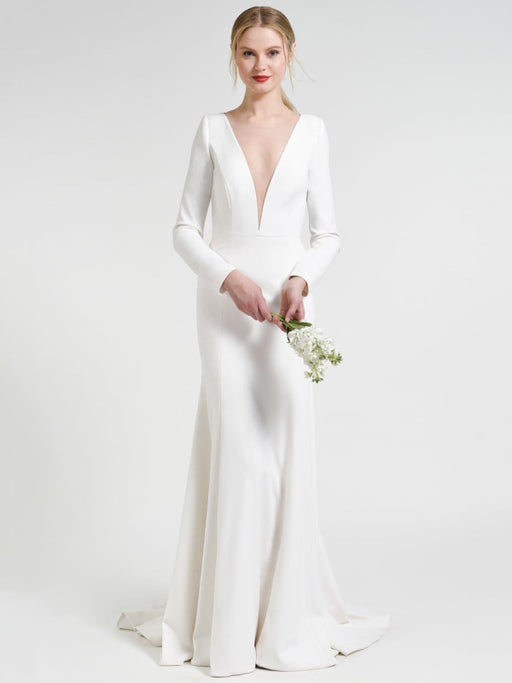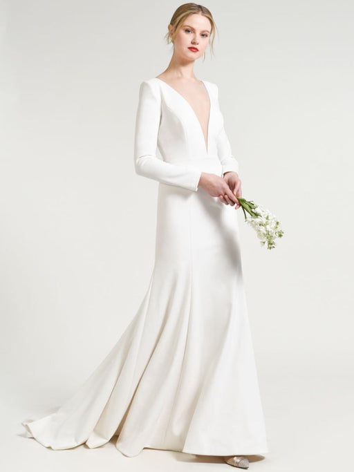 Chic Backless Long Sleeves Deep V-Neck Mermaid Appliques Lace Wedding Dress