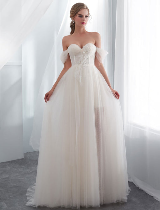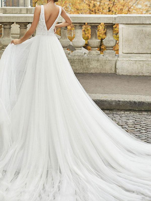 Backless White Tulle Lace Wedding Dresses V Neck Aline Bridal Dress