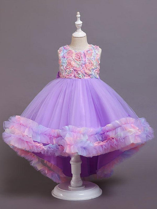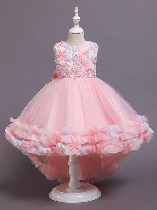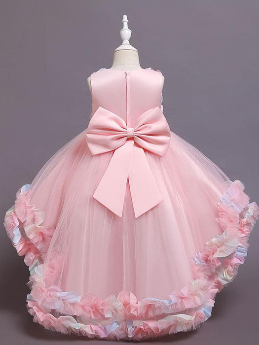 Pink 3D Floral Flower Girl Dresses Tulle Sleeveless A-Line Bows Formal Kids Pageant Dresses With Train