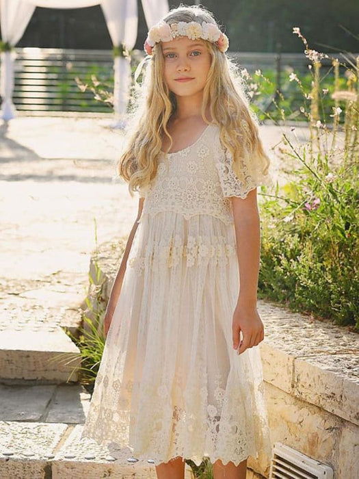 Short Sleeves Ivory Lace Formal Kids Pageant Dresses
