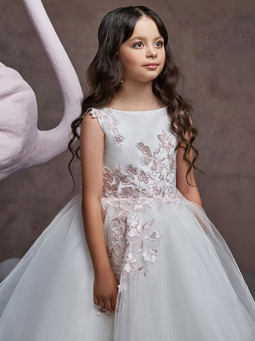 Sleeveless Sweep Princess Silhouette Embroidered Flower Girl Dresses Jewel Neck Tulle Formal Kids Pageant Dresses
