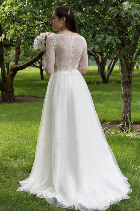 Lace Bodice Dress with Half Sleeves A Line Tulle Wedding Dresss