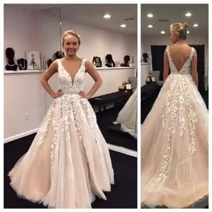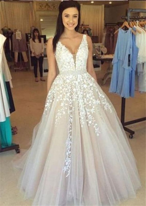 A Line Applique Tulle Prom Long V Neck Sleeveless Party Dress with Beading
