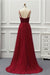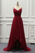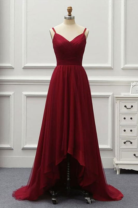 A Line High Low Tulle Prom with Train Burgundy V Neck Backless Formal Dress