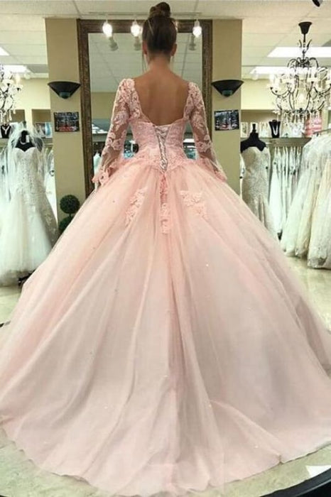 Puffy Sleeve Prom Dress with Lace Pink Tulle Long Quinceanera Dresses