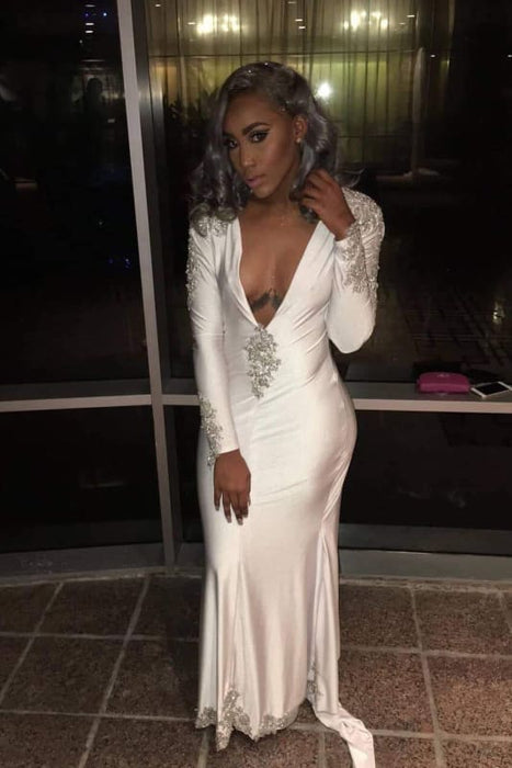 Pure White Long Sleeves Deep V Neck Evening Gown with Lace Appliques