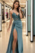 V-Neck Satin Long Split Front Prom Dress Sleeveless Spaghetti Straps Party Dress with Appliques