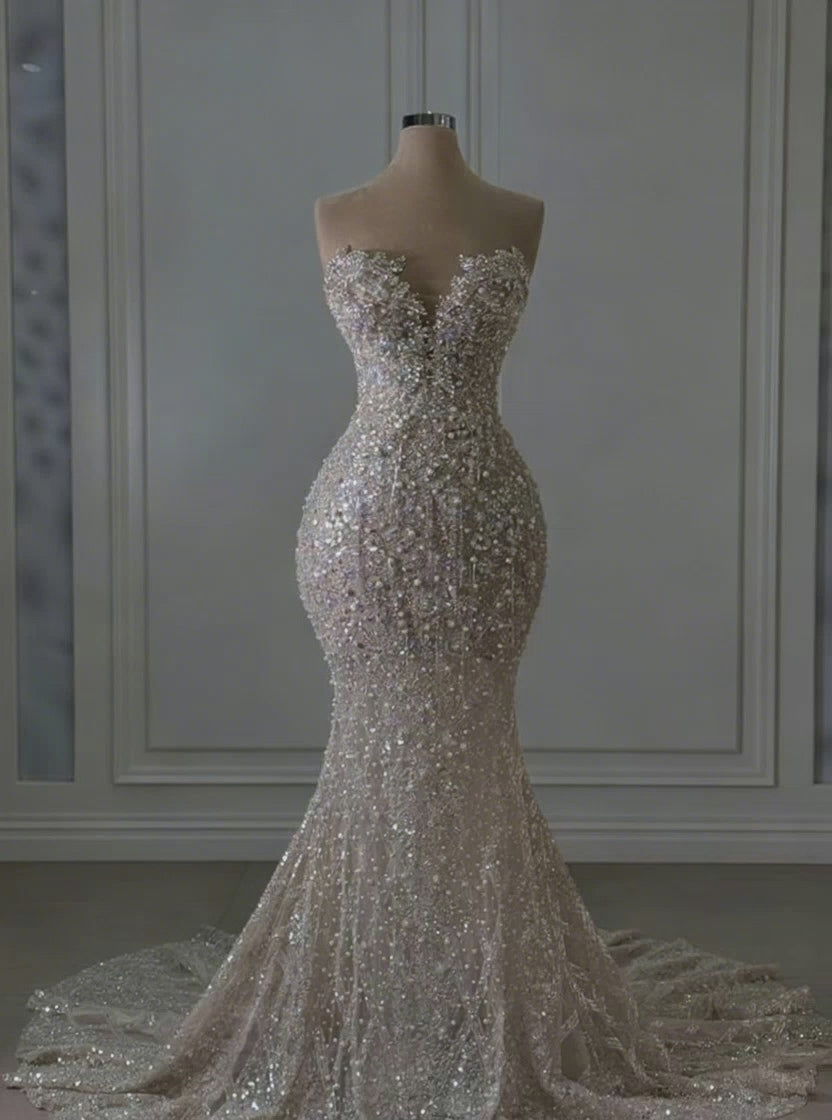 Each bead is hand-applied by skilled artisans, creating a luminous texture that catches the light with every movement. The mermaid silhouette hugs your curves gracefully before flaring into a dramatic train, ensuring you make an unforgettable entrance down the aisle.
