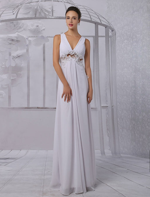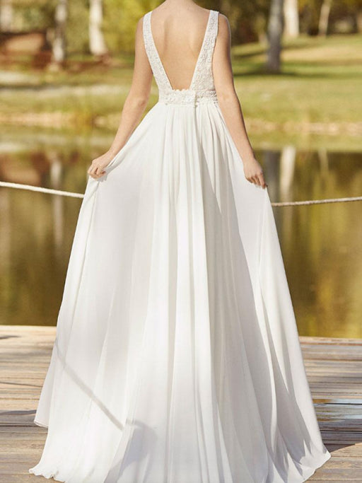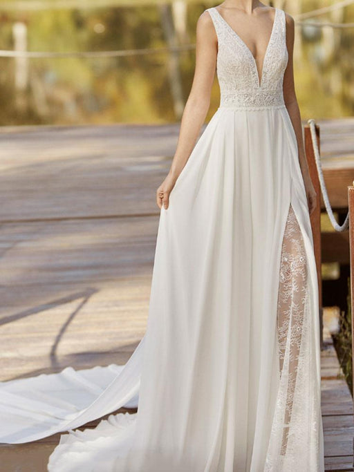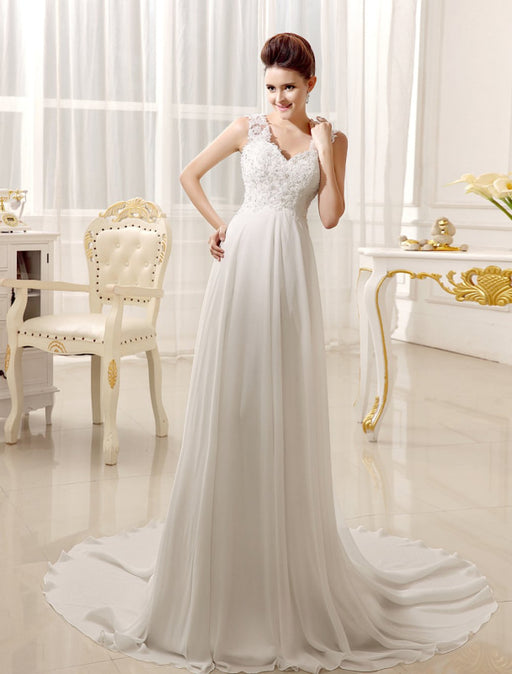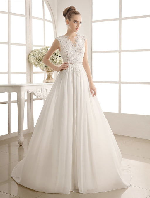 View full detailsKey Features:1. Silhouette: A-line2. Fabric: Lace3. Neckline: V-neck4. Hemline/Train: Chapel Train5. Sleeve Length: Sleeveless6. Waistline: Natural...