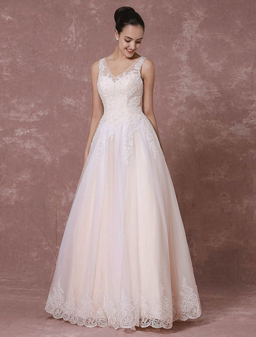 View full detailsThis Elegant Tulle Lace A-line Wedding Dress features a flattering V-neckline paired with delicate spaghetti straps, creating a timeless and gracef...