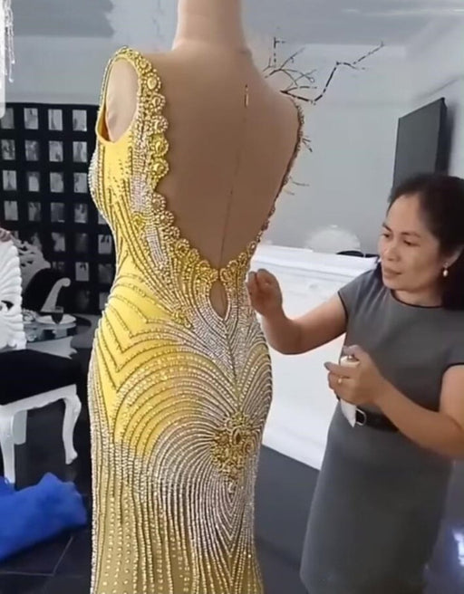 This dress is very beautiful. I took the dress to the seamstress and had her take it up 4 inches and it fit perfect. I got so many compliments.