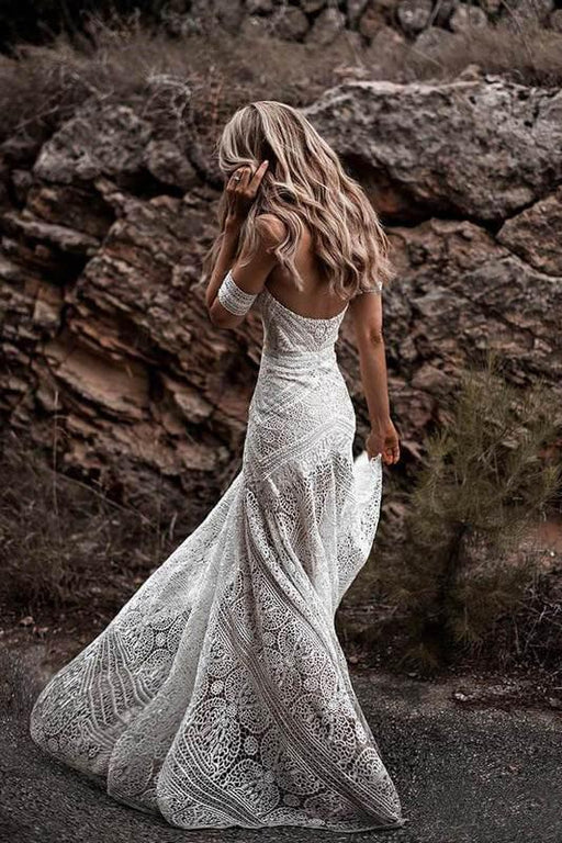 View full detailsKey Features:1. Silhouette: Mermaid2. Fabric: Lace3. Neckline: Off-the-shoulder4. Hemline/Train: Chapel Train5. Sleeve Length: Sleeveless6. Waistli...