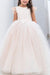 Let her shine on your special day in this exquisite sleeveless flower girl dress, crafted from delicate tulle and adorned with intricate lace appliqués. Designed for comfort and elegance, this dress captures the magic of childhood while complementing your wedding's refined aesthetic.