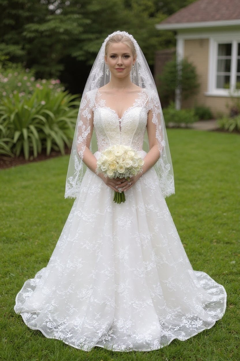 This elegant wedding dress features a high neckline and long sleeves, crafted with intricate lace appliques that enhance its timeless appeal. The A-line silhouette flatters a variety of body shapes, offering graceful movement and a refined look. Designed for brides seeking classic sophistication, this dress combines delicate craftsmanship with a graceful profile for an unforgettable bridal statement.