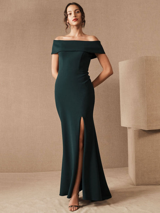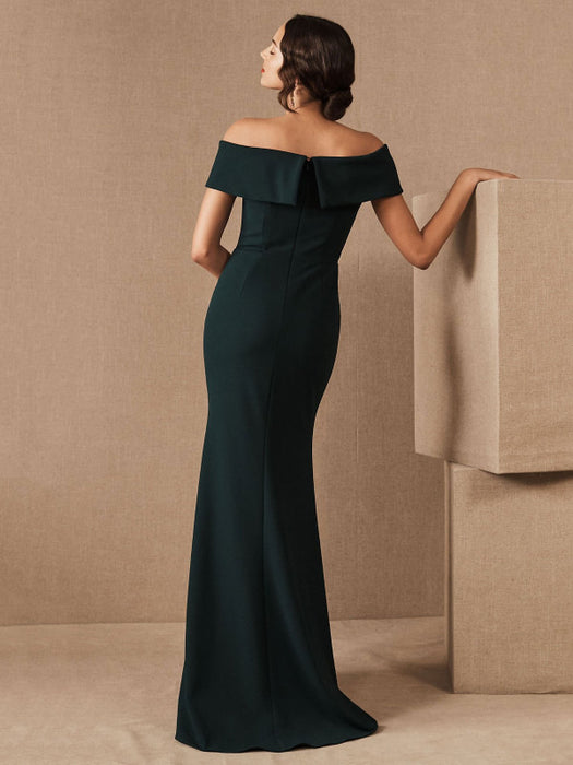 Black Evening Dress Sheath Bateau Neck Floor-Length Short Sleeves Zipper Split Front Satin Fabric Social Pageant Dresses