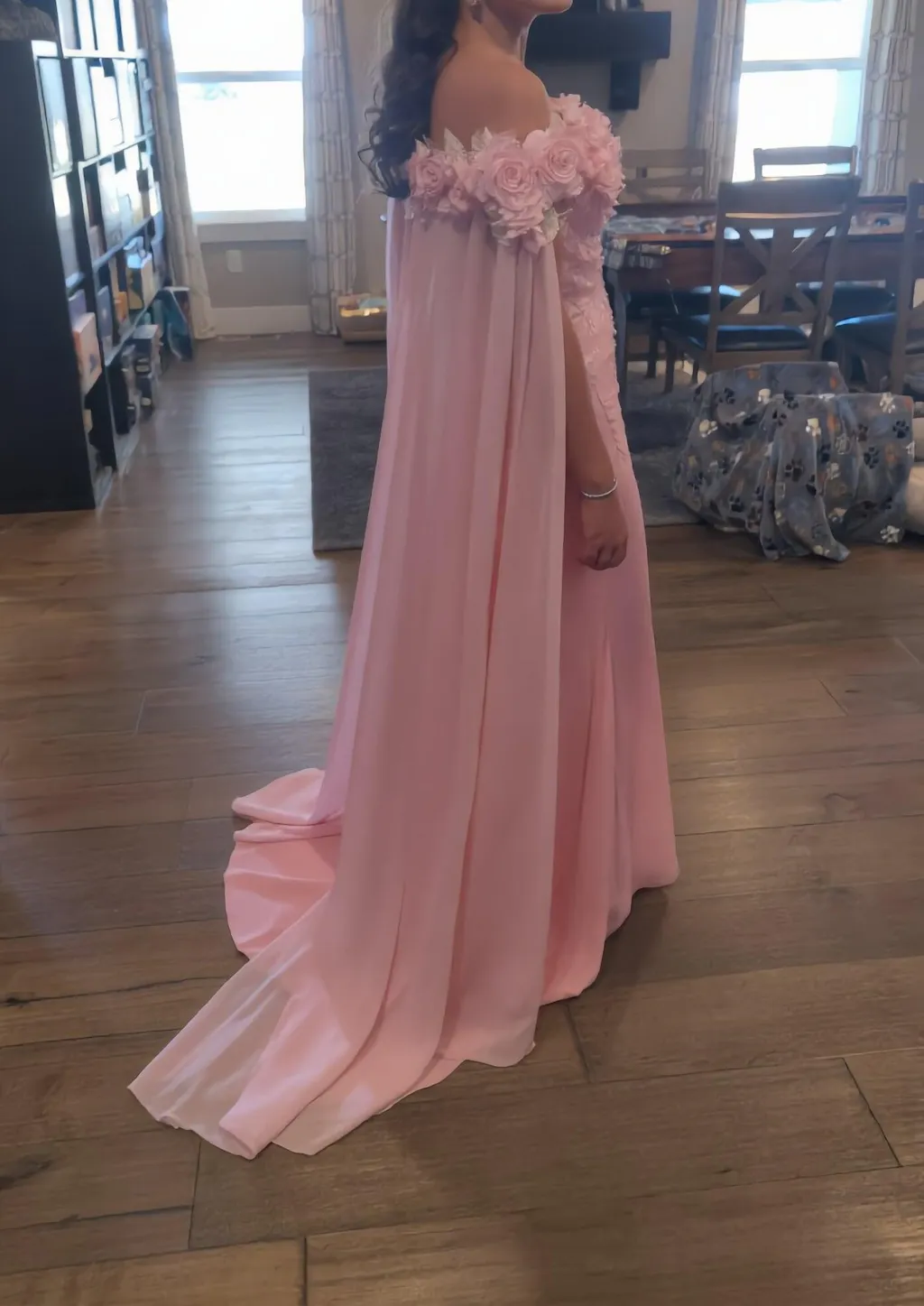 Make a stunning impression at your next wedding or formal event with this exquisite off-the-shoulder mermaid dress. Crafted from luxurious chiffon fabric and adorned with delicate appliques, this floor-length gown combines timeless elegance with modern sophistication.