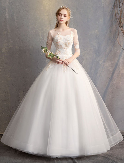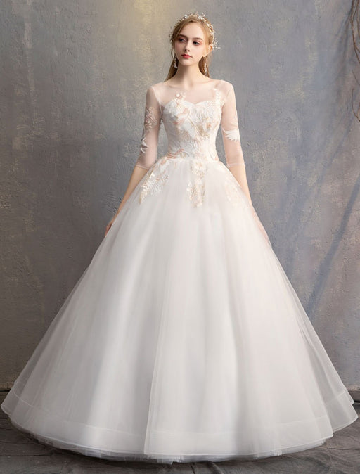 This elegant wedding dress features delicate ivory lace and a flattering V-neckline, offering timeless sophistication. The half sleeves provide a m...