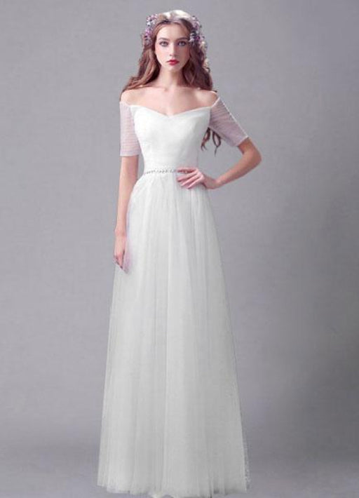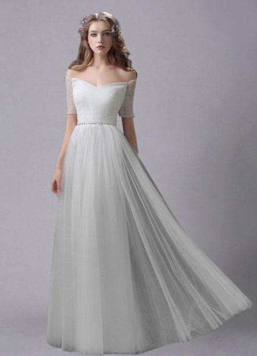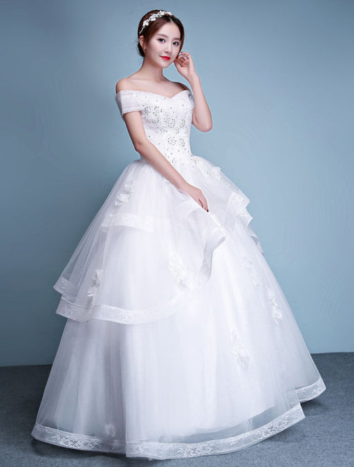 This off-shoulder white lace wedding dress features a graceful long train and delicate tulle in an A-line silhouette. Designed to enhance elegance ...