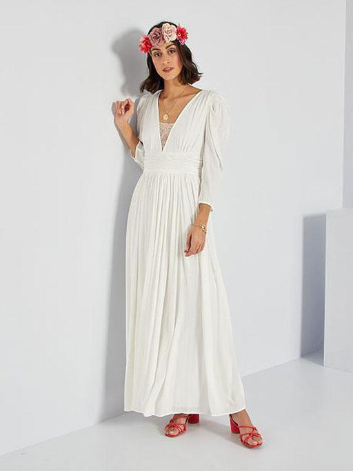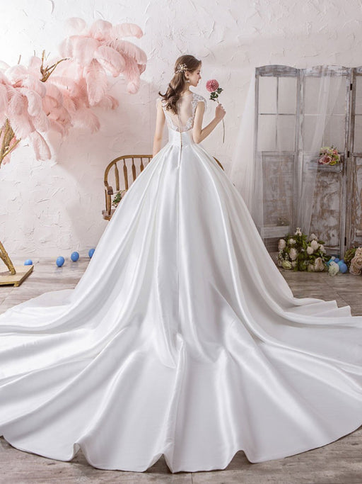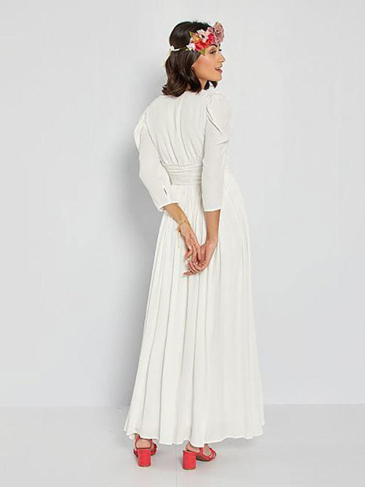View full detailsThis ivory wedding dress features a sophisticated V-neckline and an elegant backless design, perfect for brides seeking a timeless yet modern look....