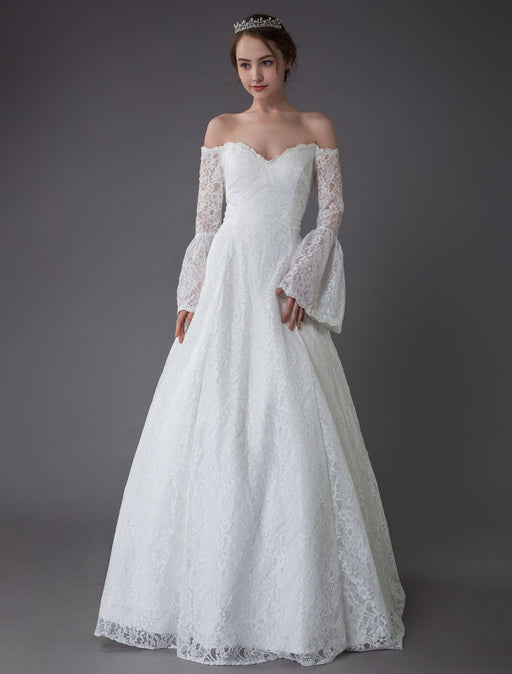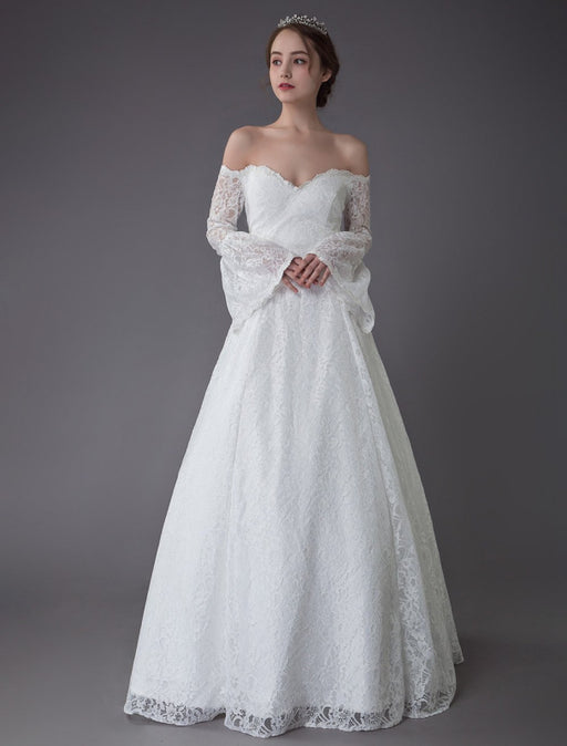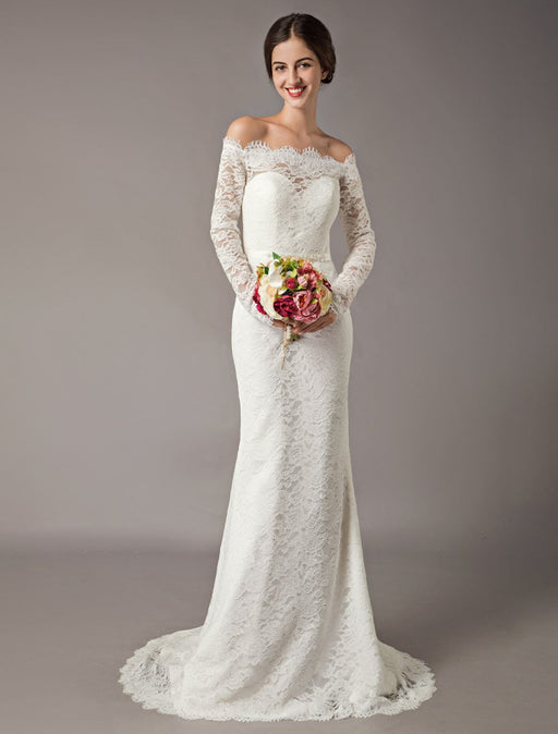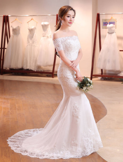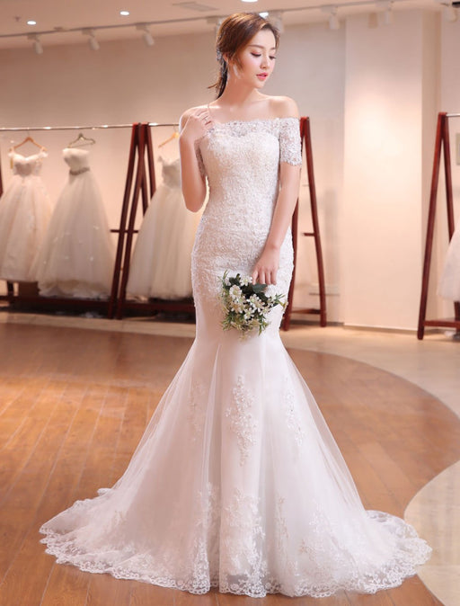 This elegant off-shoulder wedding dress showcases a timeless mermaid silhouette, crafted from delicate white lace for a refined finish. Its long, f...
