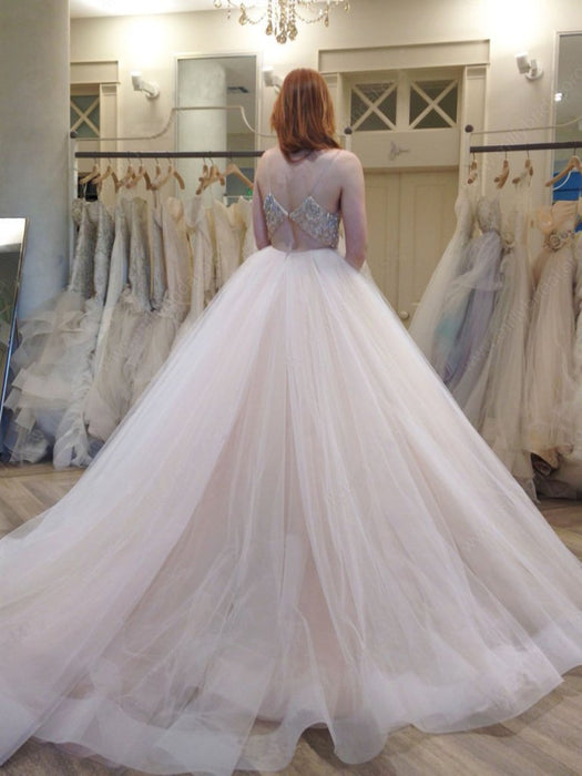 Sexy A-line V-neck Spaghetti Straps Ivory Tulle Ball Gowns Wedding Dress
