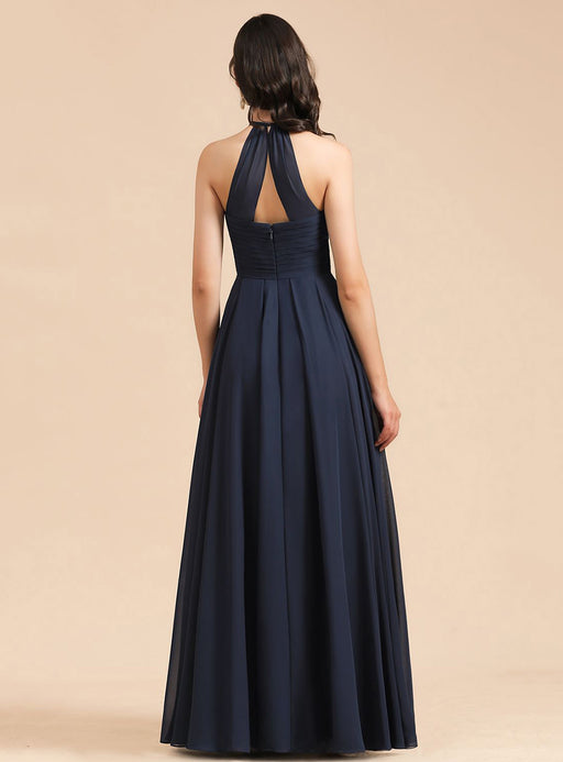 View full detailsThis halter pleated chiffon bridesmaid dress features a flattering A-line silhouette and floor-length design, offering both elegance and comfort f...