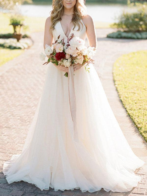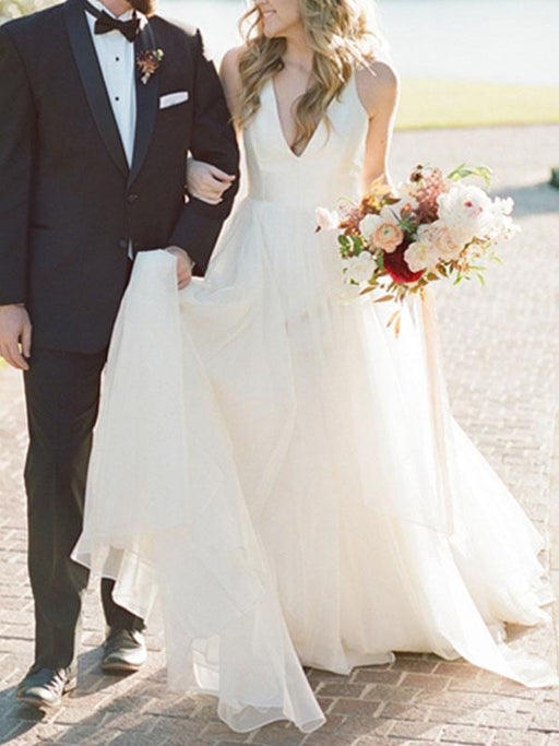 A Line Wedding Dress Ivory Blackless V Neck Spaghetti Straps Wedding Dress